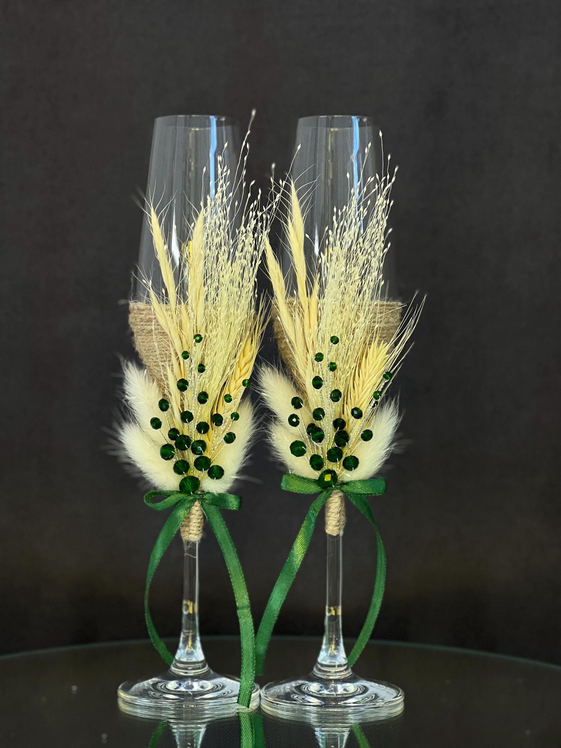 Emerald Wedding Champagne Flutes and Unity Candle Set