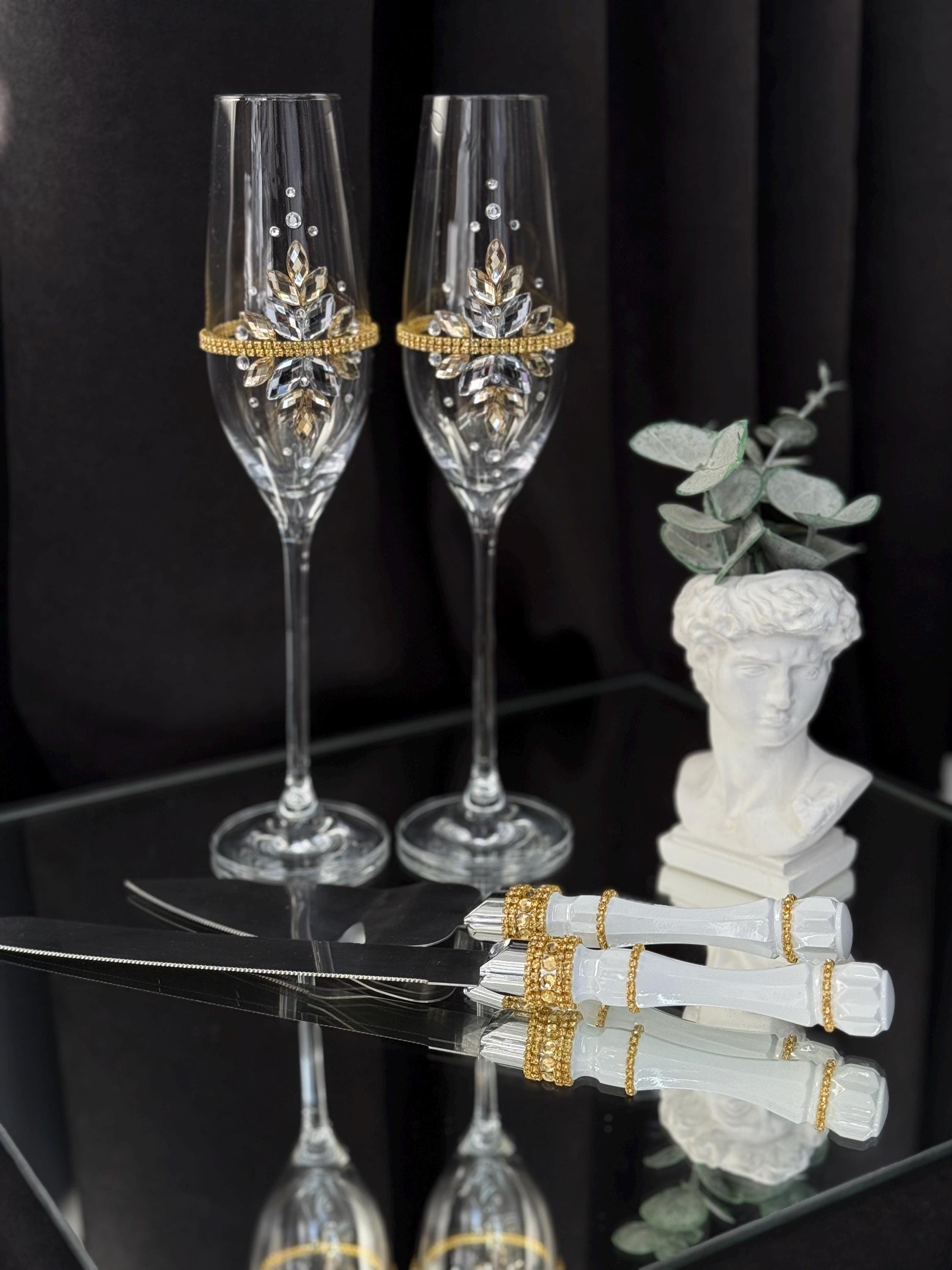 Wedding Flutes and Cake Cutting Set - Champagne Glasses with Acrylic Crystals, Gold Wedding Serving Set, Luxury Wedding Gift