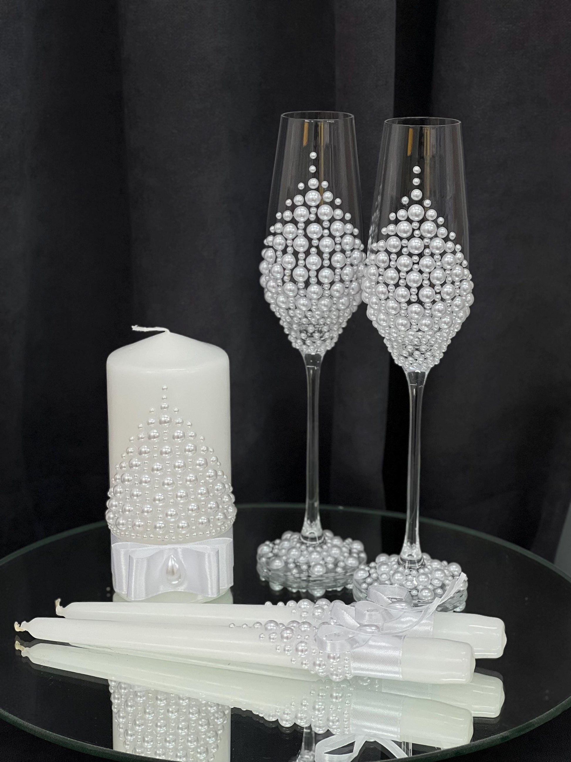 Celebrate elegance with this romantic wedding set, featuring wedding flutes and matching wedding candles decorated with delicate pearl accents. These champagne glasses and candles are perfect for the wedding toast, adding timeless charm to your wedding table decor. Ideal as a luxury wedding gift, a wedding souvenir, or a thoughtful anniversary gift for the couple.