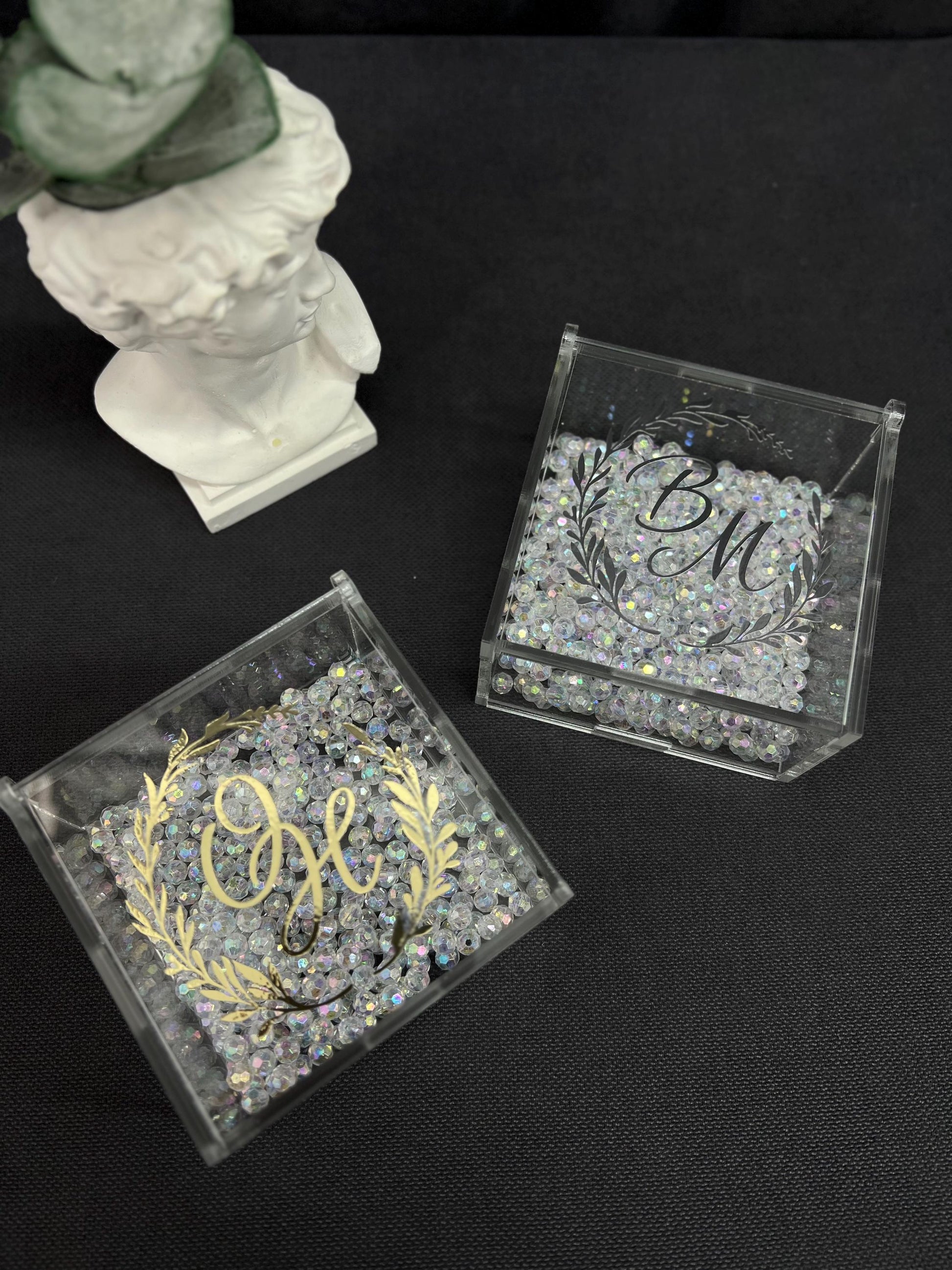 Celebrate your special day with this elegant personalized wedding ring box, handcrafted from crystal-clear acrylic and available in multiple design variations. Each luxury wedding ring holder is customizable and designed to highlight your rings in the most beautiful way.