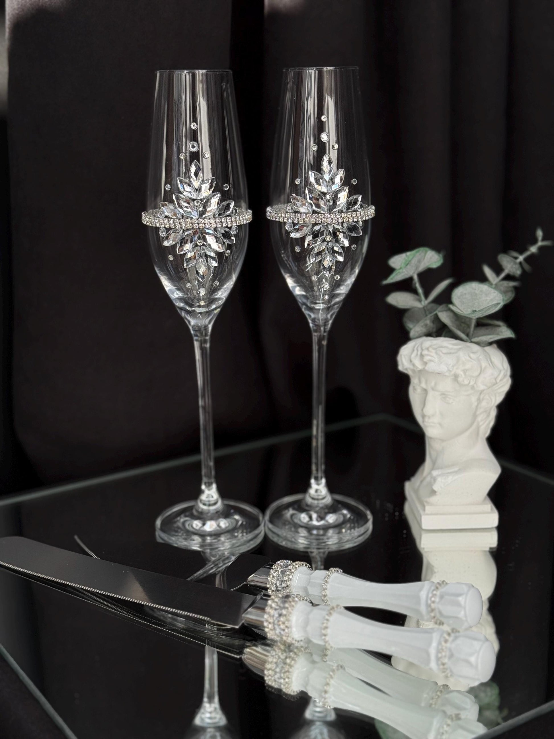 Wedding Glasses and Cake Cutting Set - Champagne Flutes with Acrylic Crystals, Silver Wedding Serving Set, Luxury Wedding Gift