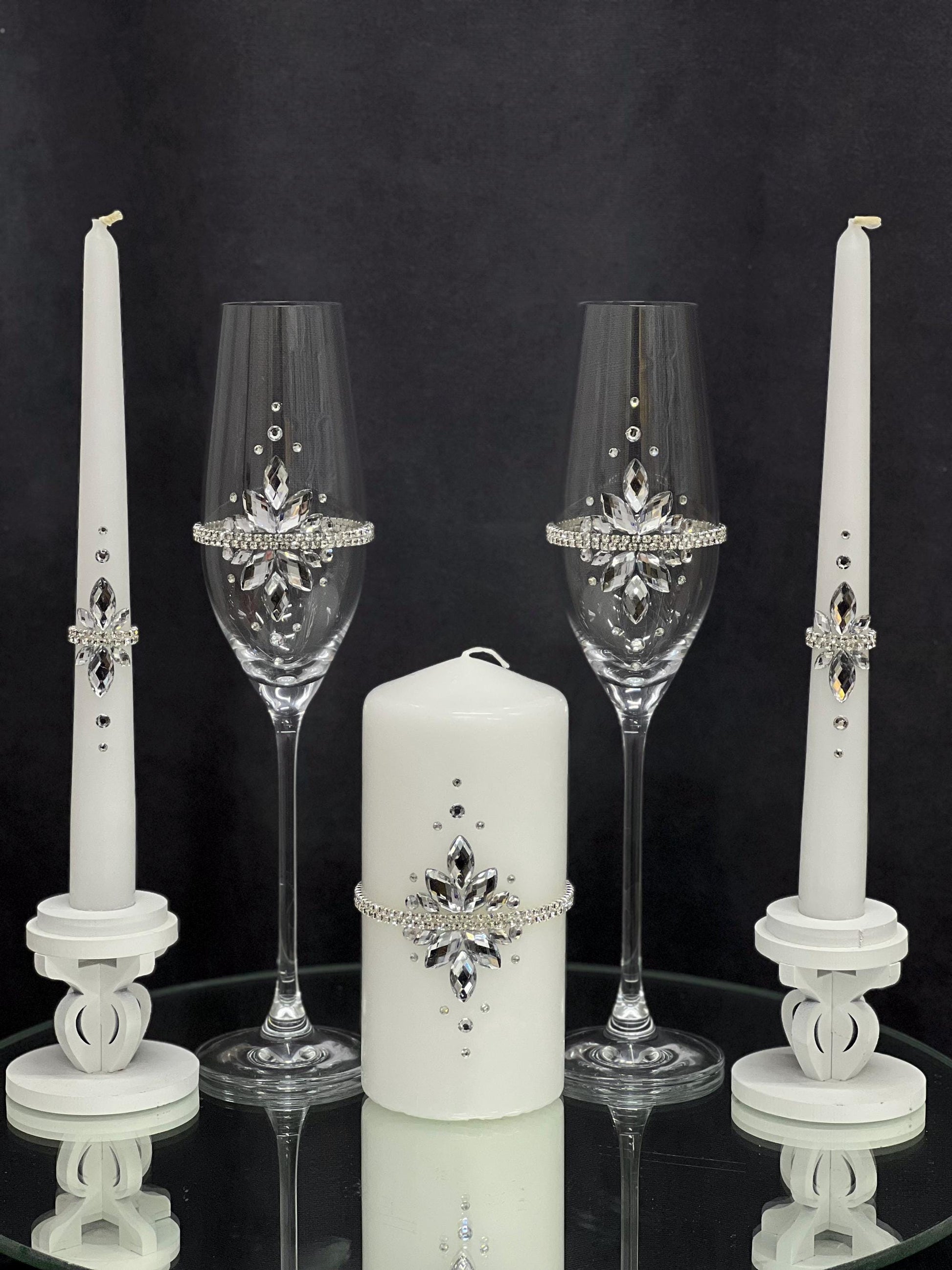 Bring romance and elegance to your special day with this beautiful wedding set, featuring personalized wedding flutes, champagne glasses, and a 3-piece unity candle set. Perfect as a luxury wedding gift, a thoughtful gift for bride, or a lasting handmade keepsake, this set also serves as a memorable wedding souvenir. Available as colored glasses gift to match your wedding theme.
