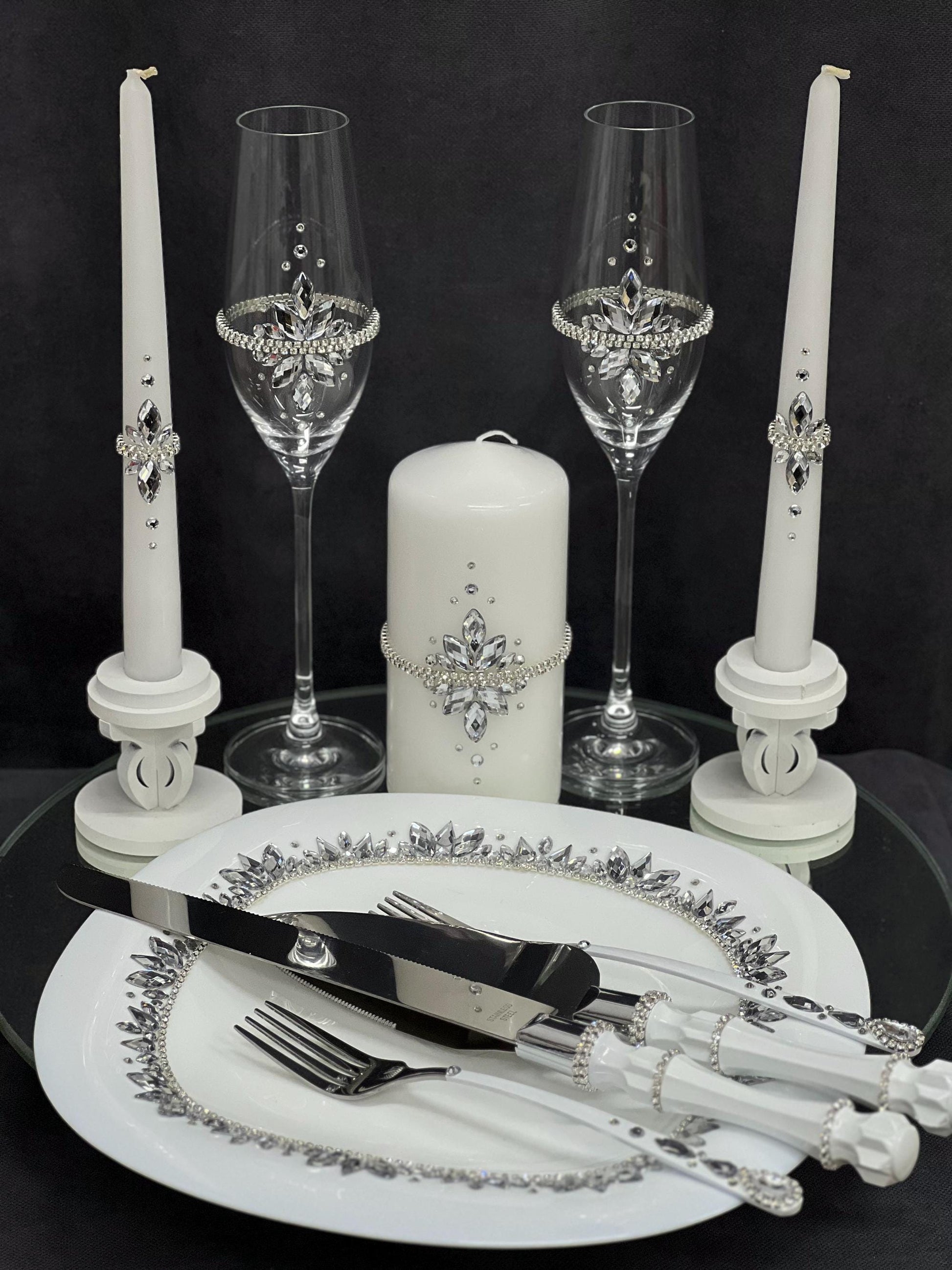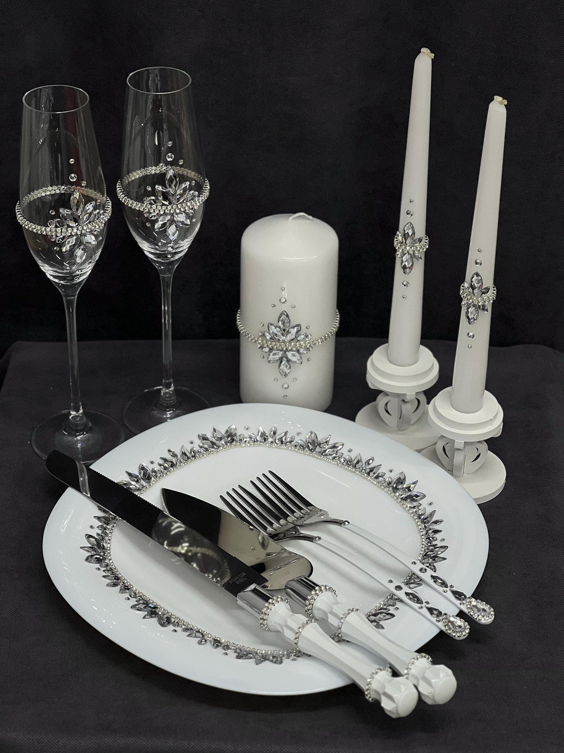 Wedding Accessories Set with Champagne Flutes, Cake Serving, Candles, Bride and Groom