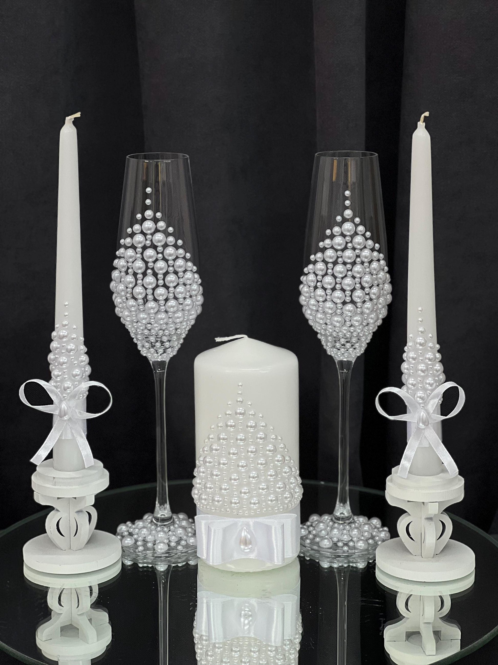 Celebrate elegance with this romantic wedding set, featuring wedding flutes and matching wedding candles decorated with delicate pearl accents. These champagne glasses and candles are perfect for the wedding toast, adding timeless charm to your wedding table decor. Ideal as a luxury wedding gift, a wedding souvenir, or a thoughtful anniversary gift for the couple.